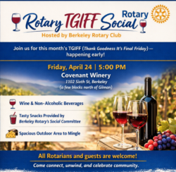 Friday April 24, 5 to 7:30 at Covenant Winery, 1102 Sixth St, Berkeley, near Gilman